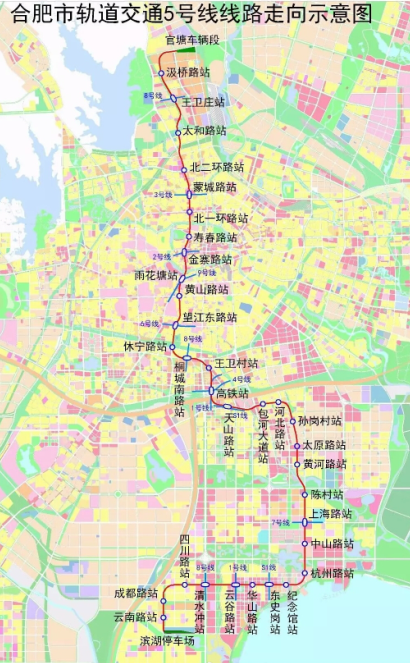 合肥市軌道交通5號(hào)線項(xiàng)目概況:線路為南北走向,南起濱湖新區(qū)的貴陽(yáng)路站,北至廬陽(yáng)區(qū)汲橋路站,全長(zhǎng)40.2公里,全線為地下線,共設(shè)車站33座(其中云谷路站、高鐵站、蒙城路站已與1號(hào)線、3號(hào)線同步實(shí)施),線路在官塘設(shè)車輛段1座、在濱湖設(shè)停車場(chǎng)1座,車輛采用B型車、6輛編組。